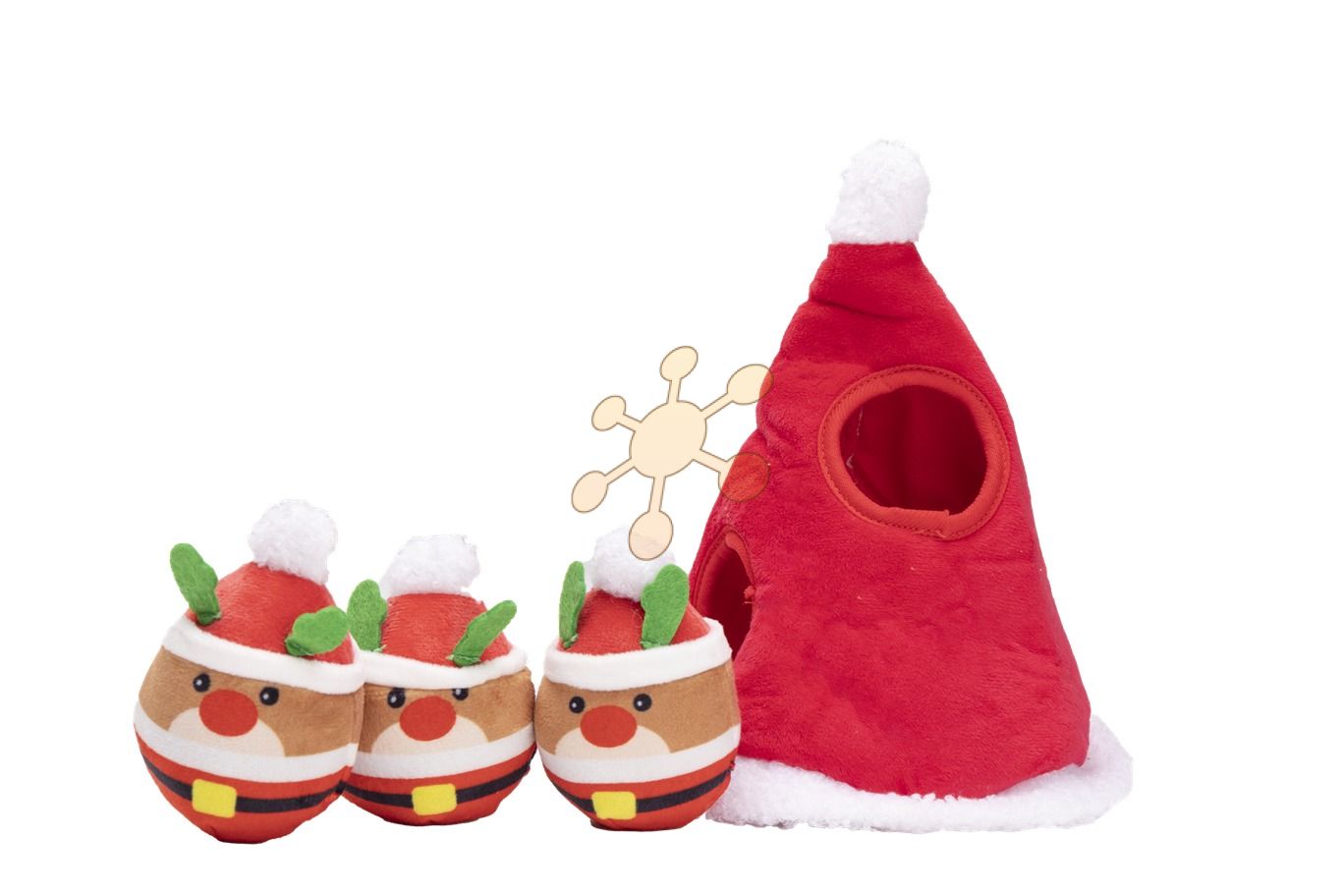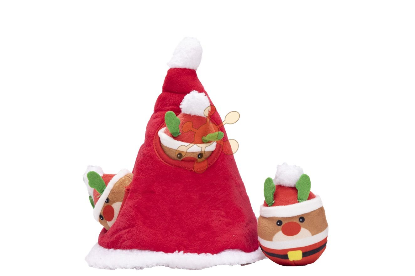 PLYŠOVÁ HRAČKA PRE PSOV SNIFFIES mini Santovia vo vianočnej čiapke s pískadlom a Vianočná čiapka: 22x18,5x18,5cm malý muž: 9,5x6,5x6cm